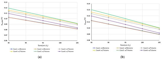 - As the ORC condensation temperature increases, both the ORC energy efficiency and CCHP exergy efficiency decrease. For Case 5 with toluene, the increase in the ORC condensation temperature from 85 to 105 °C represents a decrease of 23% of the electricity produced by the turbine.