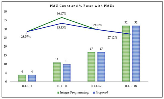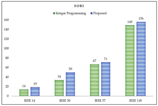 A comparison of the PMU count and percentage of buses for different IEEE standard systems allocated with PMUs by integer programming and the proposed method are shown in Figure 3. Figure 3 shows that the number of PMUs recommended by the proposed method is either equal to or less than the count suggested by the integer programming method. Figure 4 depicts the improvement in the SORI with the proposed method compared to integer programming.