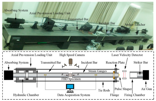 As exhibited in Figure 1, the coupled static–dynamic FBD tests were conducted using a modified SHPB device. The modified SHPB device was made of a system of bars—namely, the striker bar, the incident bar, and the transmitted bar—an axial pre-tension loading unit, and a data acquisition system. The density of the above low-alloy steel bars was 7800 kg/m3, and all of the bars had a consistent diameter of 50 mm. Since the elastic modulus E of the bars was 211 GPa, the longitudinal wave velocity was calculated by the formula ()—namely, 5201 m/s. By utilizing small copper discs as shapers, the waveform of stress wave generated by the impact of striker bar can be shaped into a ramped wave, with the dynamic force equilibrium on both platforms of the FBD specimen being facilitated accordingly. As shown in Figure 1 and Figure 2a, the FBD specimens were first clamped among the incident bar and the transmitted bar. Driven by a hydraulic chamber, the transmitted bar moved towards the incident end and was fixed by the flange; thus, the specific pre-load was successfully applied to the FBD specimens. The four tied rods were used to tighten the reaction plates to avoid bending moments in the bars. After the pre-static load was applied, the incident wave could be generated to propagate along the bars by the impact test. Due to the rapid reflection and transmission of the stress wave in the interface between the bars and the specimen, the stress waves in the transmitted bar were generated by the conversion of incident waves. With two sets of strain gauges properly mounted on the bars, in the form of a strain signal, the stress waves can be recorded without overlap. In line with the one-dimensional wave theory, as long as the strain history on bars is measured, the dynamic force history on both sides of specimens can be determined as follows [35]: