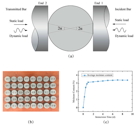 (a) Schematic of the FBD specimens under simultaneous dynamic and static loading. (b) Naturally saturated FBD specimens employed in our tests. (c) Curve of average moisture content in FBD specimens versus immersion time.