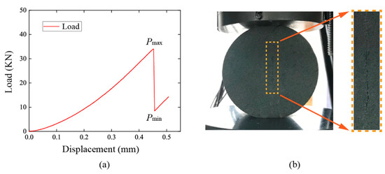 Splitting tests on naturally saturated FBD specimens under quasistatic loads: (a) load–displacement curve; (b) fracture behavior at disc center.