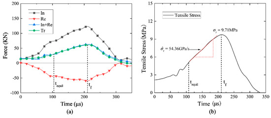 Figure 4a depicts the force history for a typical coupled static–dynamic FBD test (specimen SC-1). By shifting the time zeros of stress waves to the bar–specimen interface, and using the abovementioned Equations (1) and (2), the dynamic force histories on both side of the specimen can be determined, which are denoted as black curve In and red curve Re for incident force history and reflected force history, respectively, in Figure 4a. The dynamic force history on the incident platform of the specimen is the superposition of the incident and reflected force (represented as blue curve In + Re), while the force history on the transmitted side of the specimen is represented as green curve Tr. For rock materials, after 3–4 stress wave reverberations inside the specimen, the force on both sides of the specimen becomes consistent [42]. Since the P-wave velocity of naturally saturated sandstone is ~2570 m/s and the diameter of FBD is 87 mm, the time required for dynamic force equilibrium is ~102–135 μs. As shown in Figure 4a, during the time from the initial equilibrium moment (represented as tequil) to the peak stress moment (represented as tf)—namely, 105–211 μs—the dynamic force at both platforms of the FBD specimen is approximately equal, indicating that the dynamic force equilibrium of the FBD specimen is achieved in our tests. From Equation (4), the maximum stress in the tensile stress history can be adopted to measure the tensile strength. Moreover, as shown in Figure 4b, the slope of the pre-peak linear region of the stress history curve can be used to determine the loading rate.