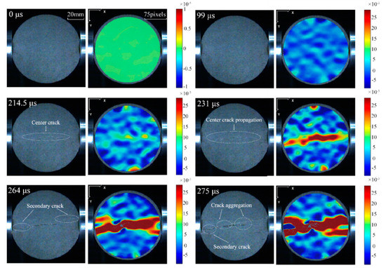 To capture the progressive fracture process during the SHPB experiment, we used digital image correlation (DIC) technology, which is based on the calculation of deformation from the reference state to subsequently deformed states on the surface of the specimen using digital images from a high-speed camera [36,37]. The high-speed camera was set at 180,000 frames per second, and provided successive digital images of specimens with a 256- × 256-pixel resolution. For the sake of improving the calculation accuracy of the DIC algorithm, random speckle patterns were painted on the facade of the specimens, which were used to calculate the strain field by tracking their movement.