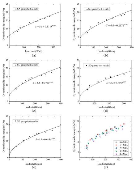 The variation of dynamic tensile strength versus loading rate at a specified static pre-tension: (a) 0 MPa for group SA; (b) 1.1 MPa for group SB; (c) 2.2 MPa for group SC; (d) 3.3 MPa for group SD; and (e) 4.4 MPa for group SE. Panel (f) shows the relationship between dynamic tensile strength and loading rate at certain pre-tension ratios.