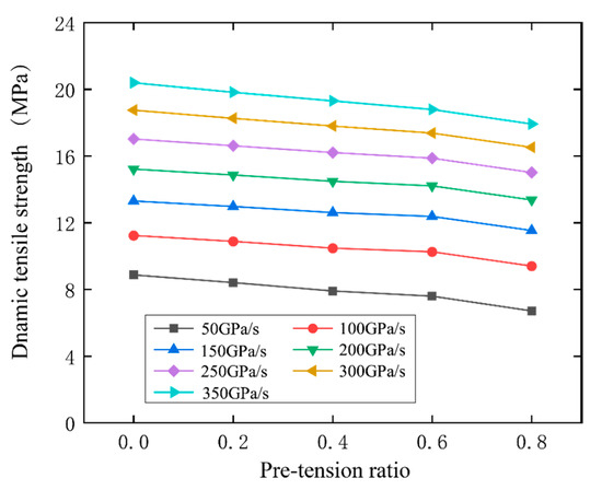 As revealed in Figure 6f, dynamic tensile strength not only displays rate dependency, but is also affected by the pre-static load. To demonstrate, the dynamic tensile strength and pre-tension ratio curves of specimen SC-1 at typical loading rates are exhibited in Figure 7. It can be observed that as the static pre-tension ratio increases, the dynamic strength at a specific loading rate consistently decreases accordingly. For instance, under a typical loading rate of 200 GPa/s (green curve in Figure 7), as the pre-tension ratio increases from 0 to 0.8 at an interval of 0.2, the strength reductions of the naturally saturated specimen are 0.34 MPa, 0.40 MPa, 0.30 MPa, and 0.81 MPa, respectively. Note that there are evident turning points at the pre-tension ratio of 0.6. The test results can perhaps be interpreted by the opening and generation of microcracks caused by static pre-tension [32]. In the wake of the increase of the pre-static load, more closed cracks open and more microcracks accumulate in the naturally saturated specimen, which decreases the dynamic tensile strength. When the pre-tension ratio exceeds 0.6, the microcracking begins to accelerate, inducing further reduction of the dynamic tensile properties.