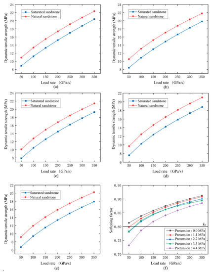The variation in dynamic tensile strength versus loading rate for naturally saturated and natural sandstone under a specified static pre-tension: (a) 0 MPa, (b) 1.1 MPa, (c) 2.2 MPa, (d) 3.3 MPa for, and (e) 4.4 MPa. (f) The relationship between softening factor and loading rate under different pre-tensions.