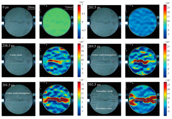 Combining high-speed photographs with DIC technology, the progressive fracture process of specimen NC-1 (from Pei et al. [32]) is shown in Figure 10, which shares a similar loading rate and pre-tension rate with specimen SC-1. The range of the legend in Figure 10—that is, the strain range—is (−10~30) × 10−3. At 258.5 μs, the specimen cracks first at the center of the disc, and an evident strain concentration bank occurs. As loading continues, secondary cracks appear on the edges of the two flat ends. Subsequently, with the propagation and coalescence of cracks, two strain concentration banks in the shape of an “X” are gradually formed, leading to the final failure. Compared with Figure 5, it can be observed that the progressive fracture processes of naturally saturated and natural specimens are similar; they both display central crack initiation and the occurrence of secondary cracks at the ends of the specimens. Finally, both specimens fail accompanied by two strain concentration banks in the shape of an “X”.