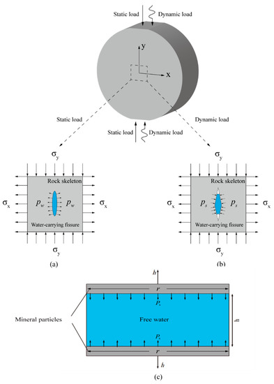 Pore water effect on rock under coupled static–dynamic loading: (a) pore water pressure under pre-static load promotes crack growth; (b) Stefan effect hinders crack growth under dynamic load; (c) a schematic diagram of the Stefan effect.