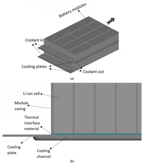 Batteries are electrochemical systems and their performance is highly dependent on the thermal operating environment. During the battery pack operations, heat is generated by the battery cells and other electronic components due to current flow and internal resistances. However, temperature levels and uniformity significantly influence the performance, safety and lifespan of the battery [5]. At high temperatures, the cells experience high impedance, accelerated ageing or even thermal runaway [6,7]. At low temperatures, their efficiency drops considerably, leaving the discharge capacity minimal [8,9,10]. This effect is important to address since, in cold climates, a large portion of the energy from the battery is spent on heating itself and the cabin, thus shortening the driving range by more than 30–40% [11,12]. Moreover, non-uniform temperature distribution within the pack leads to unbalanced charging/discharging in modules, thereby reducing the performance utilization of the pack. It is therefore important to maintain the optimum operating temperature range for all the modules and minimize module-to-module temperature variations. Hence, efficient battery thermal management strategies (BTMSs) to improve the thermal efficiency of batteries are crucial.