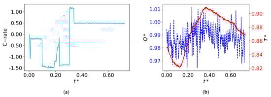 Case 1 represents a discharging/charging cycle. Figure 2 illustrates the pack operation under the scenario of Case 1. The transient current profile (Figure 2a) shows that the C-rates were varied between −1.5 and 1 C followed by a constant current charging at 0.5 C. The volumetric flow of the coolant was kept nearly constant at the inlet and a small variation in its temperature was observed as shown in Figure 2b.