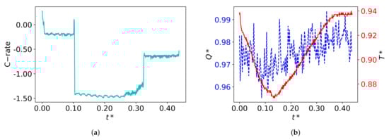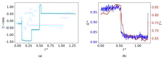Case 3 is a discharge cycle with three approximately constant current rates (−0.25, −1.5 and −0.75 C) as displayed in Figure 4a. The coolant volumetric flow rate and its temperature at the inlet were maintained nearly constant (Figure 4b).