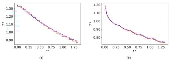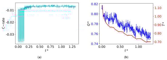 Finally, Case 4 depicts a cooling scenario when the battery pack is not operating (Figure 5a). Here, the coolant flow rate at the inlet was decreased gradually throughout the cycle by decreasing the power of the pump, as the temperature of the battery pack decreased. This is reflected in the coolant’s temperature at the inlet as well, see Figure 5b.