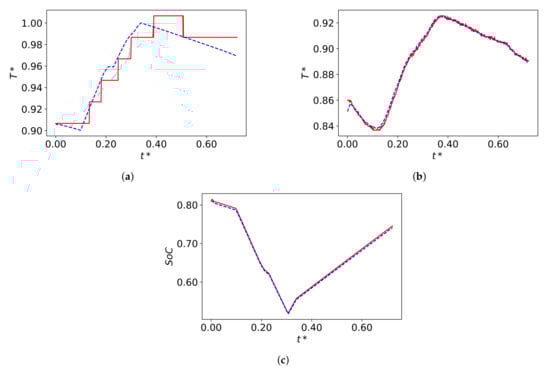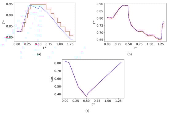 It should be noted that the step profile in the experimental temperature values is due to the resolution of the sensors used during the measurements. The sensors used for the measurement of the average pack temperature were provided by the battery suppliers and hence could not be accessed or modified. Nonetheless, the average temperature of the battery pack predicted by the simulations is in good agreement with the measurements. The average battery pack temperature was predicted well both during discharging ( < 0.3) and charging ( > 0.4) but slightly underpredicted during the transition from discharging at −1.5 C to charging at 1 C (0.3 < < 0.4). The temperature of the coolant at the outlet and the average of the battery pack were estimated well from the simulation.