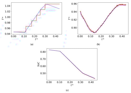 For Case 2, the simulated average temperature of the battery pack, displayed in Figure 8, was marginally overestimated compared to the measurements during the discharge phase ( < 0.5) with the maximum C-rate of −1.5 C, and underestimated during the charging phase most of which was at 0.5 C, with lower coolant volumetric flow rate and temperature. The outlet temperature of the coolant was slightly overpredicted from until the end of the cycle. The average for the battery pack was in very good agreement with the measurements through the entire cycle.