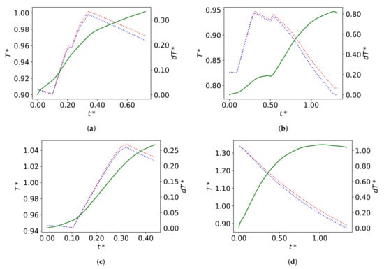 Variation in the maximum, minimum temperatures of the modules and their difference for each case: (a) Case 1, (b) Case 2, (c) Case 3 and (d) Case 4;