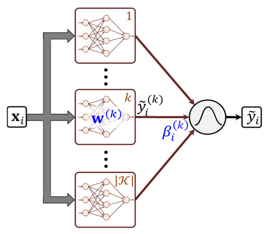 It is evident from the above expression that the quantity determines the weight assigned to sub-network in the ensemble output. Likewise, the update rule in (1) shows that the sub-network’s own weight vector is incremented in proportion to . Each sub-network can be viewed as implementing some neural network function so that,