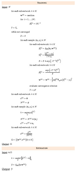 Accordingly, the Boltzmann parameter is initialized to a sufficiently high value, , so that all training samples in the dataset are equally utilized while training each sub-network. From another standpoint, corresponds to the situation where the input space is not decomposed into Voronoi partitions. Conversely, when , is binary valued, being equal to unity only for the sub-network whose output is closest to its desired value , and zero for all others. More specifically,