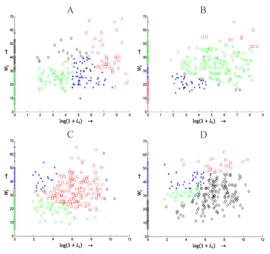 Scatter plots of lightning vs. wind speed for each sample in , colored according to the Voronoi partition in that contains . Note that has been used in the x-axis. Each plot corresponds to a city (A–D).