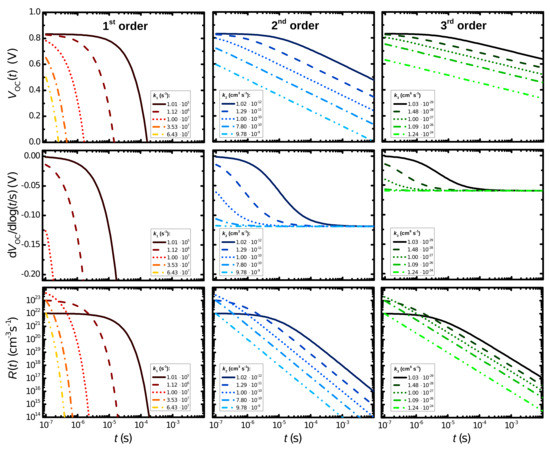The -t-traces with first order recombination exhibit a linear decrease, which is apparent from Equation (5) (note that the x-axes in Figure 2 are logarithmic). In contrast, the -t-traces with second and third order recombination follow a logarithmic decay. Interestingly, this opens up the possibility to qualitatively determine the order of recombination by determining the slope of -t-traces. To be more precise, the derivative of the open-circuit voltage versus the logarithm of the time was used, as it is more convenient to work with when using logarithmic x-axes (cf. Figure 2, middle row).
