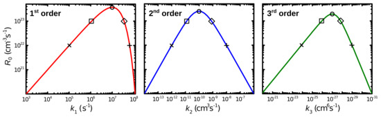 To this end, five -t-traces were analytically determined each for first, second, and third order recombination (cf. Figure 2). The initial recombination rates , which are the recombination rates for a given trace at , were kept at identical values for the five aforementioned traces to enable a better comparison between the first, second, and third order -t-plots, with the only exception being the maximum values, which did show some variations. The necessary recombination coefficients , , and to obtain the identical initial recombination rates were determined in Figure 3 and are listed in Table 1. More details about this calculation can be found in Appendix B. Interestingly, the initial recombination rates increase with increasing recombination coefficients, but then reach a maximum and subsequently decrease in value, which can be seen in Figure 3 and for some selected values in the bottom row of Figure 2. However, even though the initial recombination rates for the same recombination order may be identical, the -t-traces are significantly different owing to the rapidly changing recombination rates during the decay.