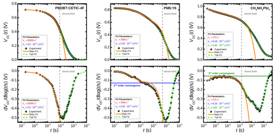 Be this as it may, it is nonetheless possible to observe that the experimental examples also converge to the -slopes discussed above for the cases of dominant second (−0.13 V) and third (−0.06 V) order recombination, respectively (cf. bottom row of Figure 4). This is very prominent for the irradiated CH3NH3PbI3 device and third order recombination, whereas it takes several orders of magnitude for the PM6:Y6 device to converge in the case of second order recombination, which would be expected from a high-performing solar cell exhibiting only limited amounts of (mostly) band-to-band recombination. However, the PM6:Y6 device is then mostly dominated by the continuously decreasing first order recombination on even longer timescales, which only leaves the time span from t = 1 × 10−5 − 5 × 10−5, where the convergence is apparent. In the case of the PBDBT:CETIC-4F, there is no noticeable convergence, which is unsurprising, since it is a device strongly dominated by first order recombination.