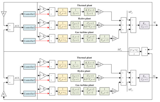 The interconnected power system has been developed in recent years to better meet power needs. To ensure the safe and reliable operation of the power system, the stability of the system’s frequency must be maintained. However, the mismatch between power generation and required power is prone to instability [1]. Therefore, load frequency control (LFC) and optimal power flow (OPF) [2] have become research hotspots in the field of multi-area interconnected power systems. The former mainly considers designing the controller to eliminate the influence of load disturbance on the frequency, and the latter determines the steady-state operating conditions containing the frequency distribution of the power system. In addition, there are multiple sources of power generation in power systems, among which thermal power generation, hydropower generation, and gas turbines are most common, and each has different characteristics. In this study, we mainly investigate the LFC of the multi-source power system.