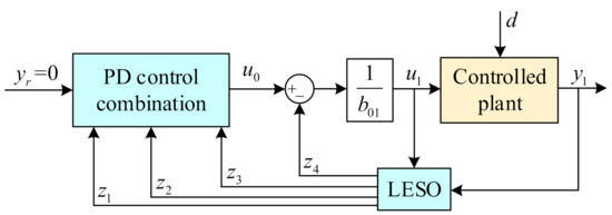 where f is the total disturbance, including the unmodeled dynamics, load disturbance, and parameter perturbation, and is an adjustable parameter. The core idea of LADRC is to estimate the total disturbance f through the linear extended state observer (LESO) and use the PD control combination to eliminate the disturbance.