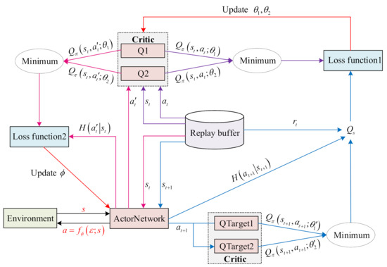 SAC is an algorithm in reinforcement learning that can solve continuous state space and continuous action space problems. The structure diagram of SAC is shown in Figure 3. It should be pointed out that, unlike Q in the traditional reinforcement learning algorithm, the Q value in SAC not only maximizes the cumulative reward but also increases entropy [34].