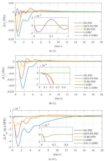 Assuming that a load step disturbance of p.u. is added to the first area at t = 0, the response curve is shown in Figure 6, and the parameters optimized by SAC are shown in Figure 7, Figure 8 and Figure 9. To verify the effectiveness of the proposed method, Figure 7 also shows the control effect of the PID controller optimized by the differential evolution (DE) algorithm [37], the PID controller optimized by the hybrid stochastic fractal search and pattern search (hFSF-PS) algorithm [38], the PID controller optimized by the teaching learning based optimization (TLBO) algorithm [39], and the LADRC controller with conventional parameters. We select the parameters of LADRC as , , and . Table 4 shows the quantification results of performance indicators, including overshoot , undershoot , settling time , and integral of time-weighted absolute error () for frequency deviation and tie-line exchanged power. We calculate based on Equation (26).