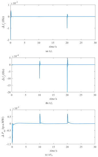 To show the ability of the proposed method to suppress different load disturbances, we add the step load disturbance of p.u. to the first area at t = 0 s, the step load disturbance of p.u. to the first area at t = 10 s, and the step load disturbances of p.u. and p.u. to the second area at t = 20 s. The simulation results of the above-mentioned trained actor-network are shown in Figure 10.