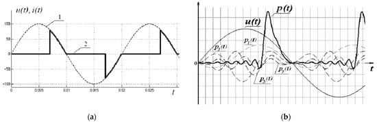 Thus, the actions of the instantaneous values of the components of , taking into account all higher harmonics, are completely mutually neutralized in the time intervals when the electronic switch is open (Figure 1b). This example shows that the power from the first harmonic of the current is not the prerogative of the manifestation of the properties of reactive elements in the AC network, but it can be considered as an imbalance of instantaneous values that have caused a shift in the components and .