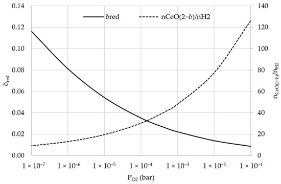 Dependency at 1500 °C between oxygen partial pressure (PO2) and reduction extent (δred, left axis) and quantity of ceria per mole of hydrogen (nCeO(2-δ)/nH2, right axis) according to Bulfin et al. [21].