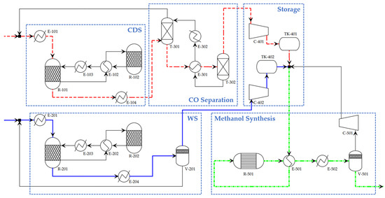 A synthetic fuel can be defined as a liquid fuel produced from the energetic upgrade of low energy feedstocks such as water or carbon dioxide [8]. When renewable energies such as solar are used to re-energize these raw materials, synthetic fuels can be considered carbon-neutral (i.e., the total amount of global warming gases released during their production and consumption is zero). Synthetic fuels could become an asset for decarbonizing transportation, but also for providing chemical industry with climate-neutral feedstocks [9]. At the same time, they can contribute to the storage of electricity surpluses from the grid during peak production of renewable energies, providing a long-term storage of electricity [10]. In the transport sector, synthetic fuels could be combined with electrification, which is an effective way to decarbonize light vehicles, but certainly not an alternative for heavy duty transportation [11]. Given that the chemical industry strongly relies on fossil fuels, both as a feedstock and as an energy source, the introduction of synthetic fuels could substantially improve its sustainability. Already available chemical routes can supply a wide range of raw materials, including methane, methanol or even synthetic crude oil [8,12]. Therefore, the transition could be possible without costly modifications on available infrastructure or final products. Methanol is an interesting commodity chemical due to its already widespread use as a fuel for internal combustion engines and chemical industry feedstocks [13,14], and thus, it is chosen as the final product for the processes described in this study. To produce methanol, carbon monoxide and hydrogen are commonly used as raw materials. These reactants are traditionally obtained from fossil resources via coal gasification or steam methane reforming. Nevertheless, green pathways are also available and are based in one of the three following options: (1) water splitting to hydrogen (WS) with reverse water-gas shift, (2) carbon dioxide splitting to carbon monoxide (CDS) with water-gas shift or (3) a combination of water and carbon dioxide splitting (also known as co-splitting). The suggested process in this study relies on the third option since previous research show that this is the most efficient pathway [15].