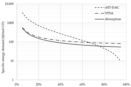 The gas outlet of the reactors is cooled down and products (H2 and CO) are separated from reactants (H2O and CO2, respectively). The separation of water and hydrogen is performed by a series of flash tanks, while the mixture of CO and CO2 must undergo a more complex process to be separated due to their low boiling points. The chosen technology in the final simulation is liquid absorption, but other alternatives have also been considered. According to literature, vacuum-pressure swing adsorption (VPSA) of carbon monoxide [44] could be a competitive alternative, while cryogenic distillation or membrane separation have too high energy consumptions [45,46,47]. In addition, the possibility of using the already available DAC equipment in order to remove the unreacted CO2 is studied, which is a novel approach. To compare the different separation alternatives, the models described on literature for liquid absorption [48] and VPSA [47] were reproduced in the same Aspen Plus® simulation. Data shown in Figure 2 was used for quantifying energy needs of CO purification with DAC equipment.