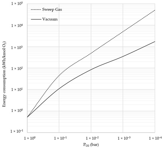 Energy consumption per mole of oxygen released to the atmosphere as a function of oxygen partial pressure (PO2). The dotted line represents the use of sweep gas with different purities under constant atmospheric pressure. The solid line shows the use of different vacuum pressures without sweep gas.