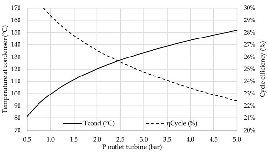 Temperature at the condenser of the Rankine cycle (Tcond, left axis) and cycle efficiency (ηCycle, right axis) as a function of turbine’s discharge pressure.