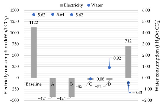 Overall electricity and water needs are calculated and shown in Figure 11. For further information on the calculations performed, a summary is shown in Table S3 in Supplementary Materials. From all the scenarios, C and E are the only ones in which no water desalination is needed because it is produced at a higher rate than consumed thanks to the LT-DAC. Subsequently, they are the lowest values in the plot. Water is also obtained in Scenario D, but since storing and transportation of CO2 must be carried out without free water to avoid corrosion, it is not transported to the production plant. When it comes to electricity, Scenario E must use some energy input from PV panels (or grid if carbon intensity of the mix is low enough) to operate, which is a consequence of the comparatively less efficient ORC. As a consequence, Scenario E shows the second highest electricity consumption, only after the baseline. From their lowest position in the figure, it is also clear that Scenarios A and B are producing more electricity than C and D thanks to a conventional Rankine cycle without co-generation that operates at higher efficiency.
