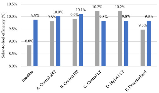 Comparison of solar-to-fuel efficiency for each scenario and baseline.