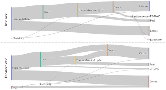 This phenomenon can be better explained with Figure 14, where two Sankey diagrams are used to describe the distribution of energy for Scenario C in the base case (PO2 = 5 × 10−4 bar, upper plot) and in the enhanced case (PO2 = 1 × 10−6 bar, lower plot). In the base case, the TCC requires more heat because higher flowrates of ceria are necessary at lower reduction extents. Due to the lower efficiency of the solid-solid heat exchangers, a remarkable amount of this heat is converted into steam that is used for powering the steam jets and the Rankine cycle. Thanks to the co-generation concept, the Rankine cycle is able to fully regenerate the LT-DAC and supply more electricity than consumed, thus avoiding the need of a supporting renewable energy.