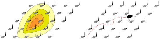 Another application using periodic sampling of only part of the network to minimize communication and power consumption may be registering events for off-line analysis, e.g., monitoring animals moving around their territory (see Figure 1 right). The sensors activated by an animal may store data in their memory and transmit them in bulk at predefined time instants. It is important to note that energy consumption may be lowered by aggregating data in a single transmission and avoiding contention thanks to optimizing the transmission schedule.