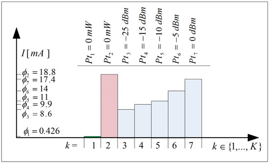 It is also assumed that each node in the network can operate in one of energy states () associated with different energy consumption and transmitted signal power levels. The first index is reserved for the sleep state, in which the radio module is not involved in communication—it is turned off. The index denotes the listening state, during which a network node is prepared to receive data from another node . The remaining energy states () are used during data transmission with different RF power levels assigned to different energy states. As the transmission signal’s power level increases, the range of wireless transmission increases, which may cause changes in the topology of the considered ad-hoc network. Each of the energy states of the node has been assigned an energy consumption level generated by the radio communication module and a power level of the radio signal transmitted by the device in the state k. For the sleep state and the listening state, the power level of the transmitted signal is equal to 0 W. It is additionally assumed that as the state index k increases, the power level of the transmitted signal increases: . With the transmission of a signal, there is a corresponding energy consumption measured in units of [mA]. Using the introduced designations, the energy model of the device can be formulated: