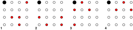 Application of proposed algorithms to periodic sensor networks involves computation of a set of frames coordinating node activity, allowing all nodes to send their data to the base node. An appropriate scenario consisting of a selected number of frames was generated by randomly drawing indexes of nodes having data to send to provide realistic results for each network. There was an equal number of data sending nodes in every frame when the number of nodes was fully divisible by the number of slots. Otherwise, it was accepted that the last scenario served fewer nodes—see Figure 3 for an example of such a scenario.