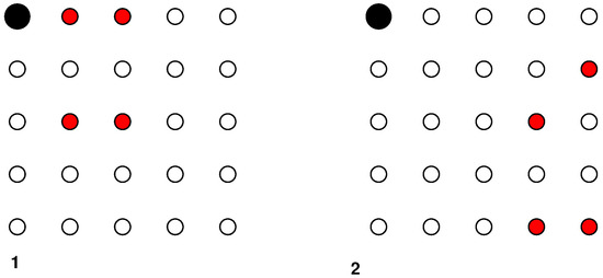 Examples of initial location of data for network of 25 nodes. The case marked “1” may be solved significantly faster than “2”. Nodes having data to send are marked in red, base station is in the larger black one.