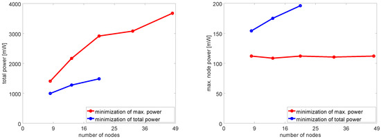 On the contrary, the performance index of the second algorithm is equal to the power needed by the node transmitting the data with the highest power setting. As it is value for a single node, it does not grow with the size of the network, and there is also significantly less variability in it. Namely, it can take one of three values related to the three power levels of the sensor. The algorithm using maximal node energy index tries to maximize network life by using many nodes transmitting the data with low power settings. This way, the battery use is balanced among most sensors. Such a strategy typically, at least for small to medium networks, leads to solutions where the nodes transmit data no more than once—it may be clearly seen in Table 7 where the maximal value of performance index is 112 mW, which equals energy consumption for the highest transmission power. On the other hand, algorithm minimizing total energy allows multiple transmissions through the same node—this fact is reflected in the right graph of Figure 5.