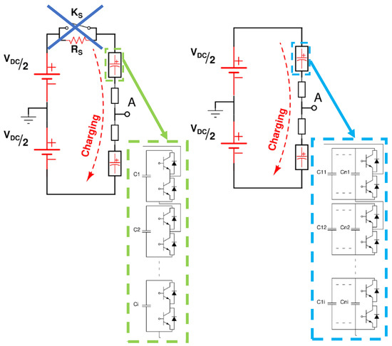 The modular multilevel converter (MMC), first proposed in [1,2], has been increasingly attracting attention especially in high- and medium-voltage applications [3,4,5] and grid-connected applications owing to its excellent characteristics [6,7,8,9]. Furthermore, the MMC technology has a bright future in renewable energy systems (RESs) due to its many advantages [10]. Furthermore, with the recent advances in supercapacitor manufacturing [11,12,13] the MMC technology is gaining much more attention. In recent years, intensive studies have been performed to enhance the efficiency of the MMC [6,14]. However, the precharging start-up control, which is a major technical problem, yet remains one of the least mentioned issues [15]. The reason why the start-up control is considered a major technical challenge arises from the fact that, unlike the conventional voltage source converters, where DC bus capacitors are centralized, in the MMC, all the submodules’ capacitors are distributed in a dispersed manner [16], and they need to be smoothly precharged to their rated voltage level during the converter start-up process before entering the normal operation state [17]. Furthermore, the submodules’ capacitors’ total charging time needs to be minimized as much as possible, so that the overall time of the start-up process decreases and the MMC enters the normal operation phase faster.