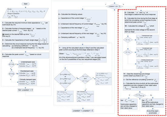 (b) Regarding the aforementioned flowchart, the 9th step is very important to ensure a smooth transition between the two start-up phases while keeping the circulating charging current constant, because at this step, the time “” is calculated; furthermore, this instance of time is of great significance as it would be used in the 10th step to calculate the submodule’s capacitor voltage “” at the peak current of the last inserted stage during the first phase of the start-up process, which is a critical voltage value for calculating the total charging time required.