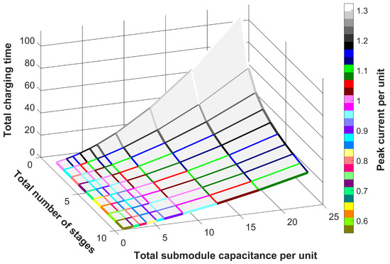 The aforementioned 4D plot reveals an important feature of the proposed method, that is as the total number of stages of capacitors at each submodule increases, the peak current (which would be kept constant during the entire start-up process) decreases “” [26], and the total time of charging (the time for the entire start-up process) decreases while the total submodule’s capacitance is kept constant. “”;