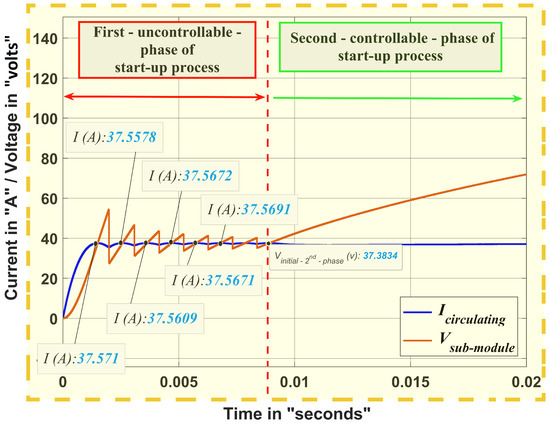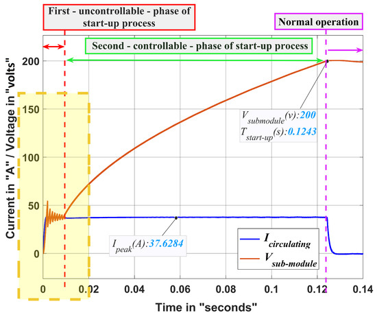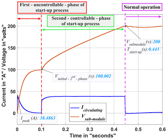 In Figure 4, the typical MMC submodule’s topology is used, where there is a single capacitor of 8400 F at each submodule. The conventional start-up method was employed where, for the first—uncontrollable—phase of the start-up process, in order to limit the value of the peak current so as not to exceed the maximum value (38.5 A), a starting resistance of “4 ” was used. In the second—controllable—phase of the start-up process, the closed-loop precharging control was employed, and the value of the reference circulating current was taken as the same as the peak current value that occurred during the first phase (38.48 A) in order to make sure that the current never—in both phases of the start-up process—exceeded the maximum value (38.5 A).