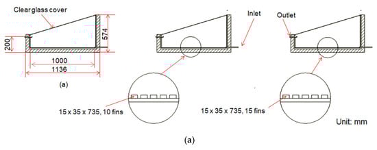 Absorbers used in this study: (a) geometry and schematic drawing of flat absorber and absorbers with 10 and 15 fins [1], (b) photograph of flat absorber for Case A, (c) photograph of absorber with 10 fins for Case B, and (d) photograph of absorber with 15 fins for Case B.