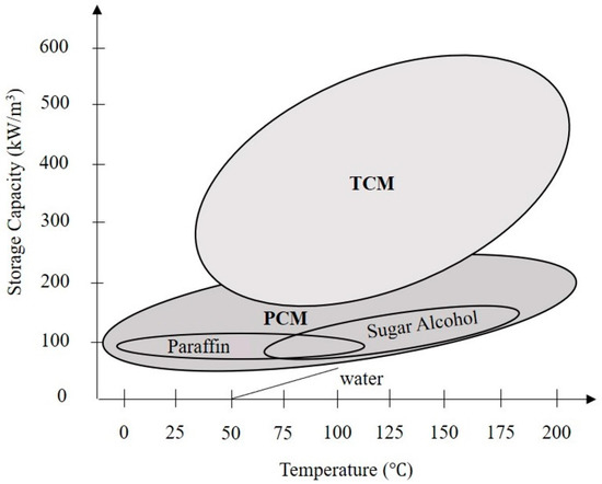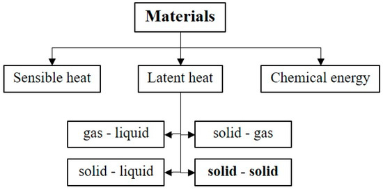 There are many types of heat storage, including sensible heat, latent heat, and chemical heat (see Figure 1). In comparison between chemical heat and latent heat, chemical energy materials can store more heat than latent heat materials as shown in Figure 2. However, as chemical heat storage is more complex in practice, it is less common than latent heat storage.